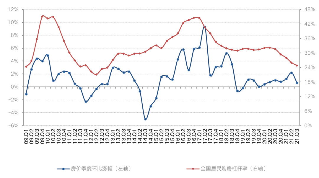 圖:全國居民購房杠桿率與百城房價指數(shù)環(huán)比漲幅