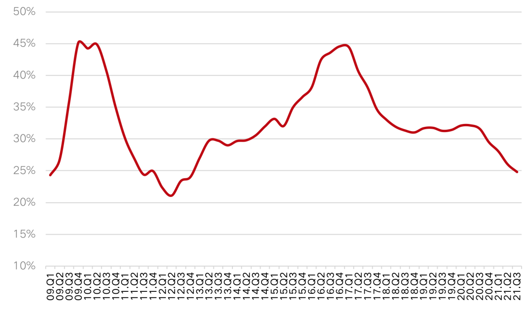 根據(jù)易居研究院估算,2021年三季度,全國居民購房杠桿率為24.8%,環(huán)比下降1.2個百分點,同比下降6.8個百分點,該指標(biāo)從去年二季度開始持續(xù)下降,已創(chuàng)2012年四季度以來近9年新低。
