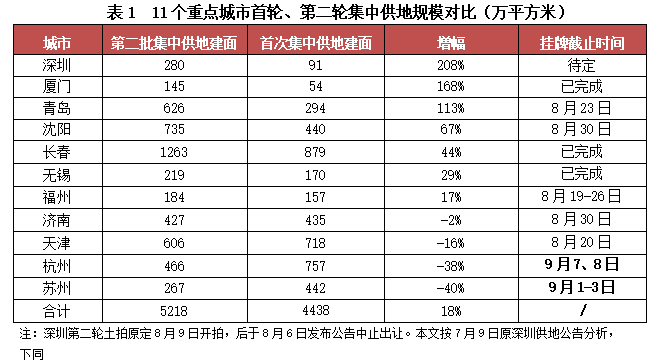 截止8月5日,22個重點城市中正式發(fā)布第二輪集中出讓公告城市已經(jīng)過半(11城,其中長春、廈門已于6月拍完,無錫也于8月2日拍完),該輪集中供地11城總供應建面(僅統(tǒng)計涉宅地)達5218萬㎡,較首輪供應總建面增加了18%,供應規(guī)模明顯增加。