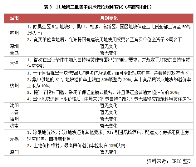 土拍規(guī)則方面,本輪集中供地競拍規(guī)則較首輪更加完善和細化,體現(xiàn)了精準調(diào)控的方向,尤其是上輪競拍中市場熱度較高的杭州、無錫、蘇州等城市,均針對其首輪拍地時暴露出的問題,出臺了“打補丁”新規(guī)。