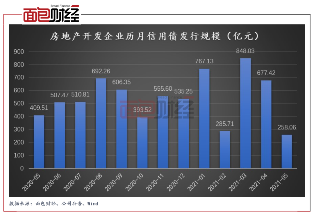 按照發(fā)行公告日口徑統(tǒng)計(jì),2021年5月,國內(nèi)房地產(chǎn)開發(fā)企業(yè)發(fā)行境內(nèi)信用債合計(jì)融資258.06億元,環(huán)比下降61.91%,同比下降36.98%。