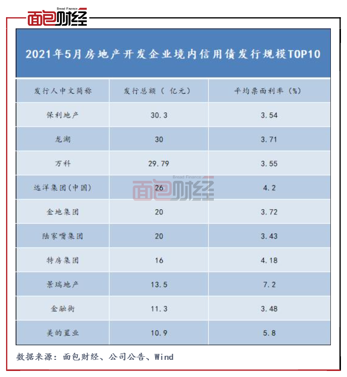 根據(jù)Wind數(shù)據(jù),2021年5月,在新發(fā)行境內(nèi)信用債的房企中,保利地產(chǎn)發(fā)行信用債融資最多,金額為30.3億元,平均票面利率為3.54%;其次為龍湖集團(tuán),融資金額為30億元,平均票面利率為3.71%。