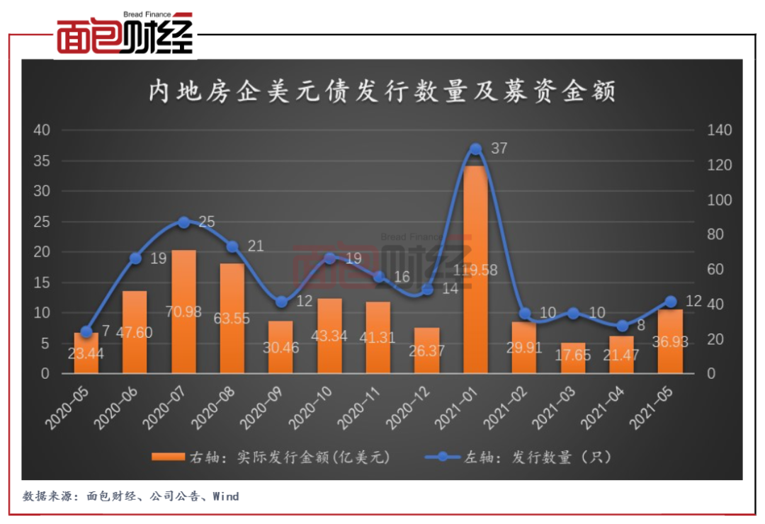 圖4:2020年5月至2021年5月內(nèi)地房企歷月美元債發(fā)行數(shù)量及募資金額