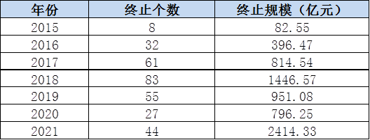 根據(jù)上交所公司債券信息平臺(tái)數(shù)據(jù)顯示,2015年10月20日至2021年5月26日,“終止”ABS項(xiàng)目單數(shù)為308單,對(duì)應(yīng)規(guī)模為6901.79億元。其中2015年終止8單,82.55億元;2016年終止32單,396.47億元;2017年終止61單,814.54億元;2018年終止83單,1446.57億元;2019年終止55單,951.08億元;2020年疫情期間終止27單,796.25億元;2021年終止44單,2414.33億元。具體情況如下圖表所示: