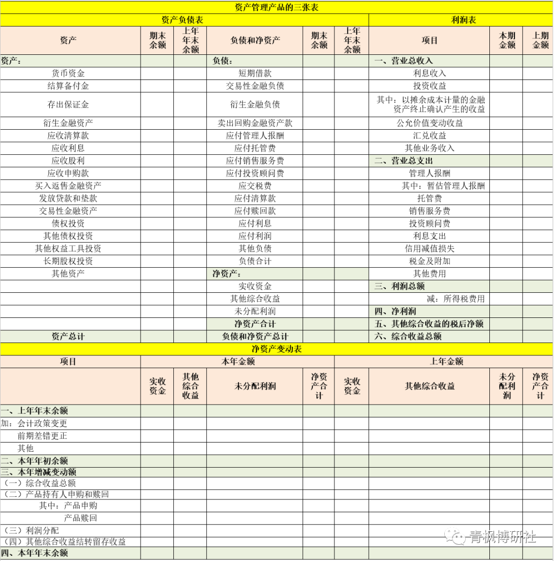 (4)豁免現(xiàn)金流量表編制要求,也即資管產(chǎn)品僅需編制《資產(chǎn)負(fù)債表》、《利潤(rùn)表》以及《凈資產(chǎn)變動(dòng)表》三類。