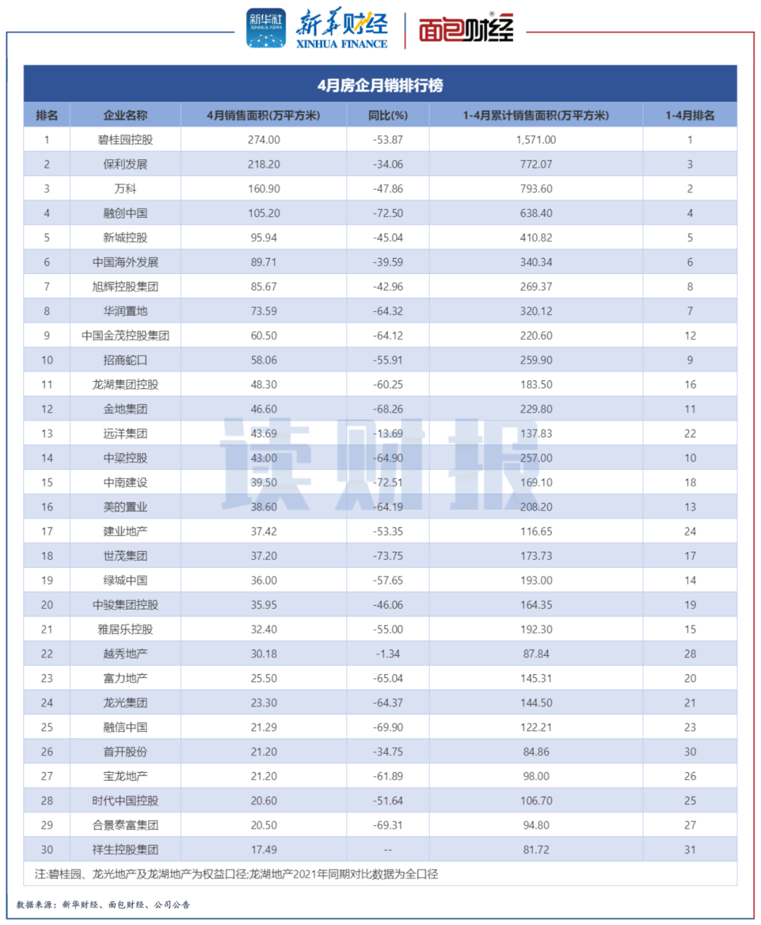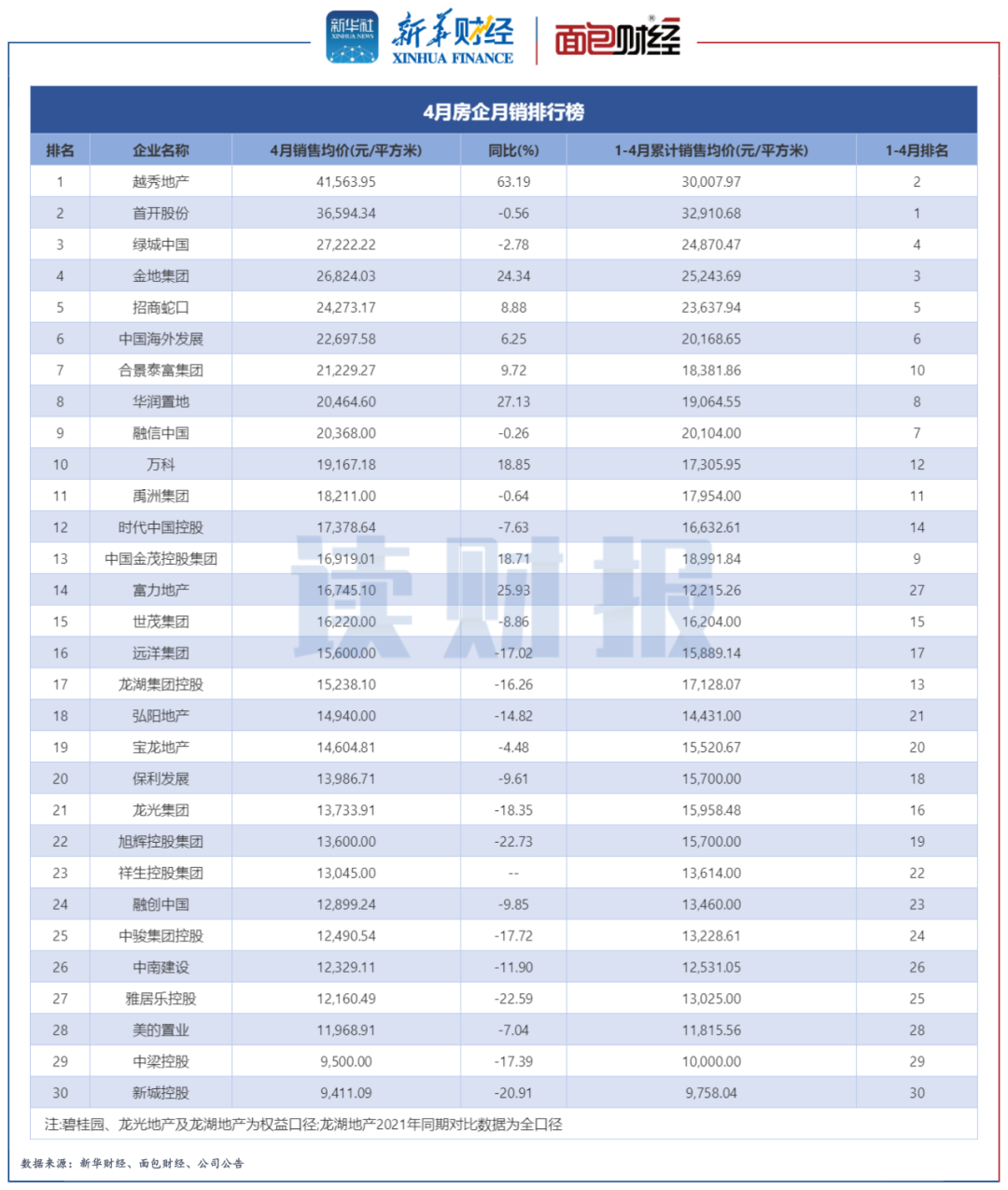 主流上市房企2022年4月銷(xiāo)售數(shù)據(jù)已經(jīng)披露完成。新華財(cái)經(jīng)和面包財(cái)經(jīng)研究員在剔除部分?jǐn)?shù)據(jù)披露不全的上市房企后,以滬、深、港三大股票交易所39家主要上市房企為樣本,分別統(tǒng)計(jì)銷(xiāo)售金額、銷(xiāo)售面積以及銷(xiāo)售均價(jià)排名前三十的企業(yè)。