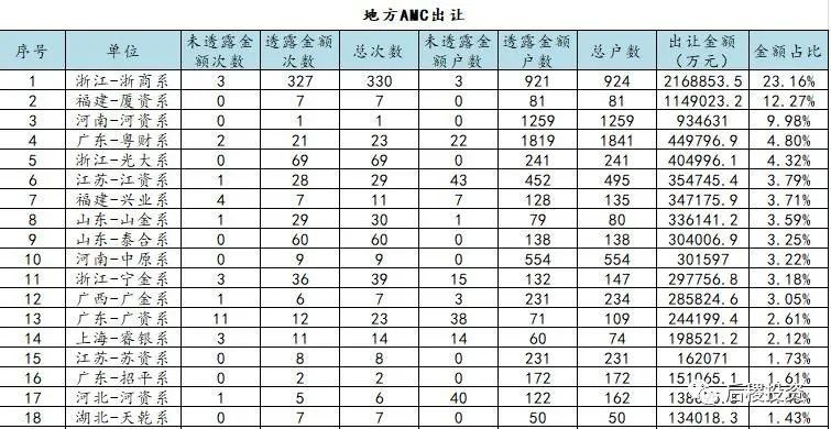 當(dāng)年全國地方AMC受讓621次10711戶,披露的總金額為1909.48億元。從受讓總次數(shù)上看,浙江的地方AMC表現(xiàn)得最為活躍。而從受讓總金額上看,浙商系遠遠超出其他地方AMC,而除浙江外,福建、河南和廣東的地方AMC的受讓規(guī)模相對較高。