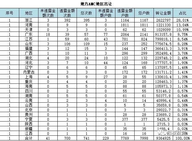 從上表看,地方AMC債權(quán)出讓的熱點地區(qū)仍舊是浙江、廣東、山東和江蘇,金額占比均超過了5%,其中浙江28.28%為絕對熱點區(qū)域。河南能排在第二位,是因為河南資產(chǎn)從東方河南省分公司手中接過一個1200多戶總債權(quán)額94億元左右的的打包,轉(zhuǎn)手給了子公司合伙企業(yè)河南信恒。而天津的出讓金額能排在第三位,是因為7月份福建的興業(yè)系從廈門的廈資系手中,接過了一個天津冶金集團總債權(quán)額94.45億的大包。