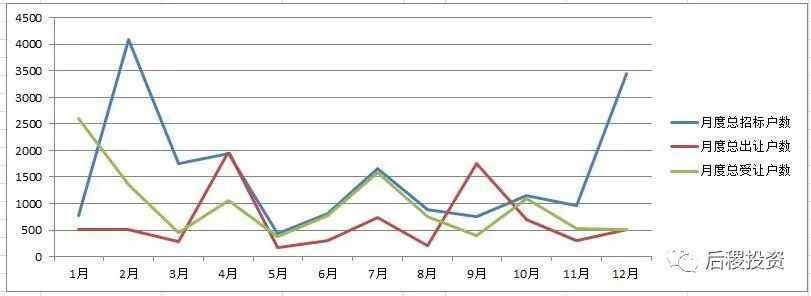 地方AMC在全年各月的招標曲線,和出讓、受讓曲線的在緯度上的距離,與四大全國AMC同樣的曲線的緯度距離相比,差距要小得多,這是因為地方AMC在整體資產(chǎn)存量上和四大AMC差距很大。在次數(shù)上,除12月外,各指標曲線在大多數(shù)月份是相對平緩的,而在戶數(shù)上則因資產(chǎn)包性質(zhì)的不同而在個別月份有所異常波動。從金額曲線上看,整體招標規(guī)模是在圍繞每月200億元上下波動,而出讓規(guī)模則是大多數(shù)月份在50-100億之間,受讓規(guī)模在在1月和9、10月呈現(xiàn)高峰,其余月份圍繞150億每月的中線浮動。