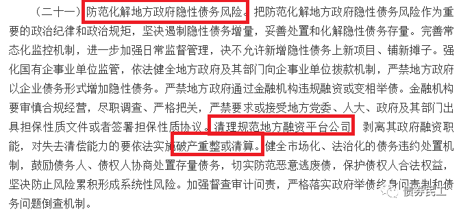 但是,這并不是監管文件中第一次提出這個說法。2021年4月13日,國務院印發了《關于進一步深化預算管理制度改革的意見》(國發[2021]5號),已經明確提出“清理規范地方融資平臺公司,剝離其政府融資職能,對失去清償能力的要依法實施破產重整或清算”。
