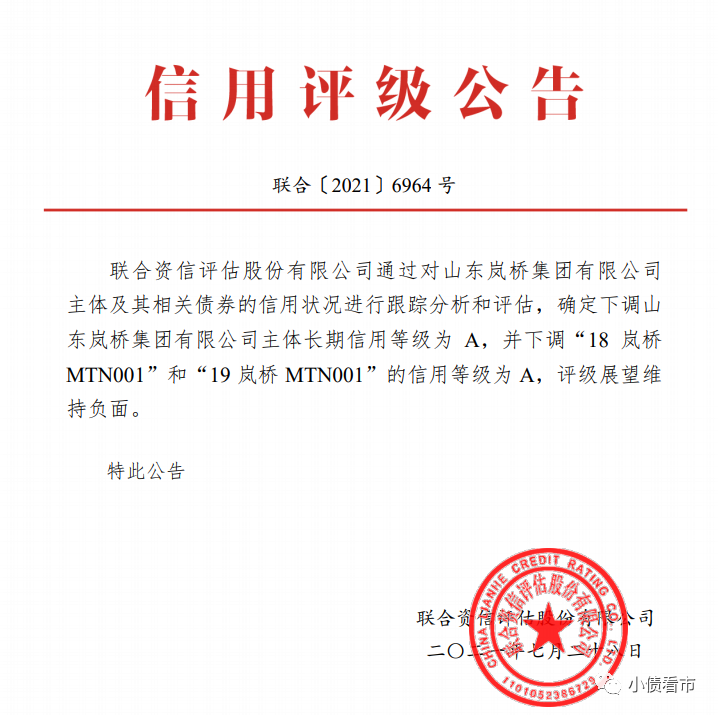 7月30日,聯(lián)合資信公告稱,將山東嵐橋集團(tuán)有限公司(以下簡(jiǎn)稱“嵐橋集團(tuán)”)主體長(zhǎng)期信用等級(jí)由AA下調(diào)為A,將“18嵐橋MTN001”和“19嵐橋MTN001”的信用等級(jí)由AA下調(diào)為A,評(píng)級(jí)展望維持負(fù)面。