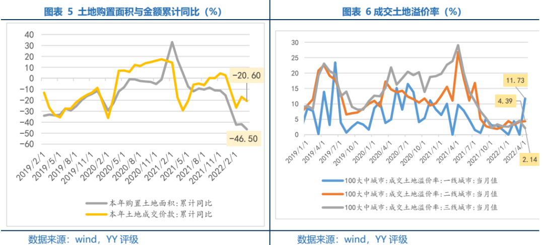 另一方面,經(jīng)濟(jì)走弱下收入預(yù)期的下降導(dǎo)致購(gòu)買力降低+對(duì)地產(chǎn)行業(yè)悲觀預(yù)期+疫情限制銷售等多重利空因素壓制銷售端反彈無(wú)力,4月銷售金額累計(jì)同比下滑近30%。拿地端從4月以來(lái)的集中供地表現(xiàn)來(lái)看,除深圳外平均溢價(jià)率僅2.73%,天津、南京、濟(jì)南和東莞的流拍率較高,且多以國(guó)企和當(dāng)?shù)仄脚_(tái)托底為主。此外,資金到位的規(guī)模和結(jié)構(gòu)仍在惡化,預(yù)收房款和按揭的下降反映購(gòu)房需求疲軟依舊。