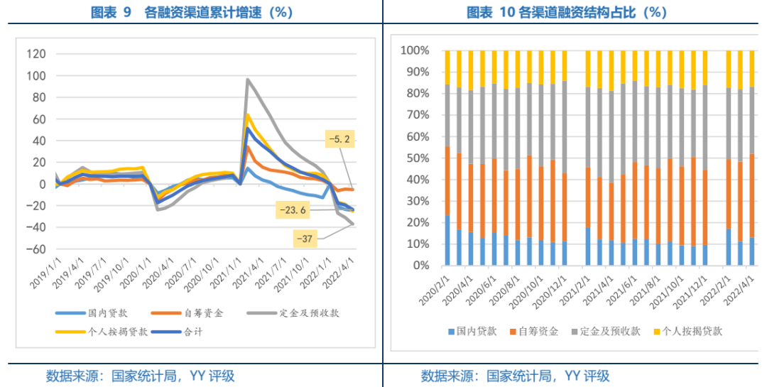 資金來(lái)源端4月還在邊際惡化,結(jié)合4月金融數(shù)據(jù),新增居民貸款中住房貸款減少605億,同比少增4,022億,購(gòu)房者對(duì)后續(xù)樓市信心持續(xù)下降。根據(jù)統(tǒng)計(jì)局?jǐn)?shù)據(jù),22年1-4月房地產(chǎn)開(kāi)發(fā)企業(yè)到位資金同比下降23.6%,較1-3月份繼續(xù)下跌4.0pct。具體渠道看,貸款、自籌資金、預(yù)收款和個(gè)人按揭分別同比-24.4%、-5.2%、-37.0%和-25.1%,分別較1-3月-0.9pct、-0.4pct、-6.0pct和-6.3pct。其中經(jīng)營(yíng)性回款(即預(yù)收款和個(gè)人按揭)的到位資金中占比持續(xù)下滑。預(yù)計(jì)后續(xù)地產(chǎn)資金來(lái)源仍處于偏緊狀態(tài),需要緊密跟蹤的是在政策持續(xù)強(qiáng)力的供給端放松推動(dòng)下,到位資金可能下跌幅度逐漸收窄,具體要看來(lái)自需求端刺激下的經(jīng)營(yíng)回款貢獻(xiàn)更大還是融資政策放松下融資現(xiàn)金的回籠更顯著,二者也互為因果。