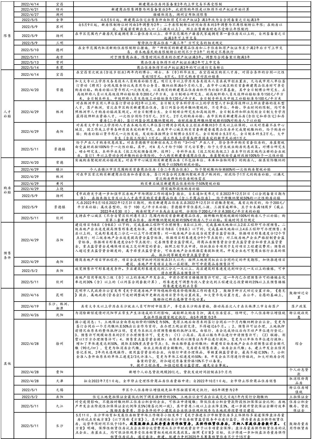 截至5月16日,22年以來(lái)全國(guó)累計(jì)出臺(tái)紓困政策近300次,當(dāng)前樓市松綁較之前進(jìn)入第二階段,更多省會(huì)強(qiáng)二線城市加入,如成都、杭州、蘇州等,更有長(zhǎng)沙提出的創(chuàng)新思路即“鼓勵(lì)存量房做租賃房”,但這些政策實(shí)操層面有諸多限制,且更大目的在下行時(shí)托市,針對(duì)于遠(yuǎn)郊和二手房市場(chǎng),邊際改善程度有限。