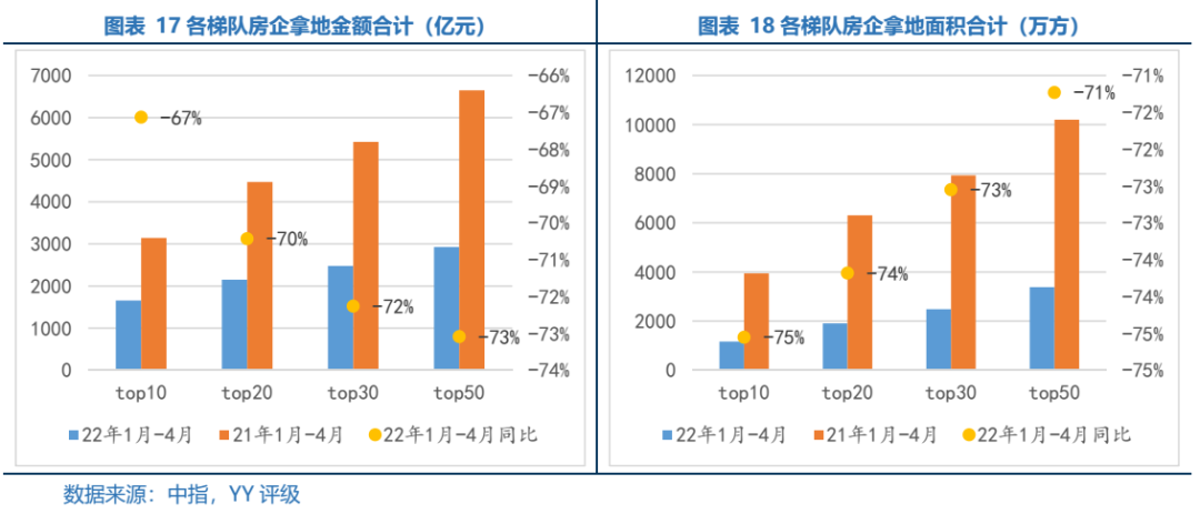 2022年1-4月全國(guó)TOP50房企拿地金額同比下滑幅度持續(xù)超70%,top10拿地金額僅1654億元,同比下滑67%。同樣,拿地面積各梯隊(duì)同比均下滑70%不等。一端是銷售近5成的下滑,另一端是拿地超7成的跌幅,前50梯隊(duì)的房企未來(lái)對(duì)地產(chǎn)開(kāi)發(fā)的貢獻(xiàn)恐還將進(jìn)一步下滑,其中幸存的品牌頭部房企與地方城投、國(guó)企將構(gòu)建新的行業(yè)格局。