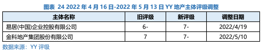 2022年4月16日至5月13日,YY評(píng)級(jí)綜合評(píng)估行業(yè)基本面、個(gè)體信用資質(zhì)及負(fù)面輿情等因素,下調(diào)2家地產(chǎn)主體評(píng)級(jí),易居(中國(guó))企業(yè)控股有限公司評(píng)級(jí)下調(diào)主要系依賴的房屋買賣和公關(guān)服務(wù)模式受疫情影響較大,生存環(huán)境惡化;金科地產(chǎn)集團(tuán)股份有限公司評(píng)級(jí)下調(diào)主要系旗下理財(cái)產(chǎn)品“小金牙”存在逾期兌付情況,流動(dòng)性進(jìn)一步承壓。