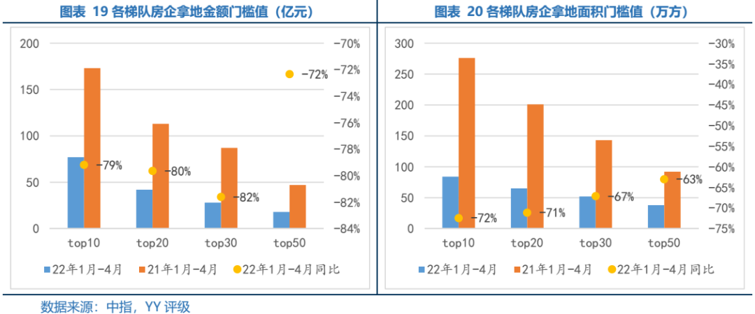1-4月份行業(yè)內(nèi)各梯隊(duì)銷售累計(jì)值和門檻值的下跌幅度均較1-3月份繼續(xù)加大,行業(yè)整體規(guī)模收縮的背景下,偏尾部房企可能面臨“無(wú)樓可售”的情況,而靠前隊(duì)伍中的出險(xiǎn)房企則面臨“去化不掉”、“繼續(xù)停止拿地”的現(xiàn)象,行業(yè)生存環(huán)境的惡化并未改變。