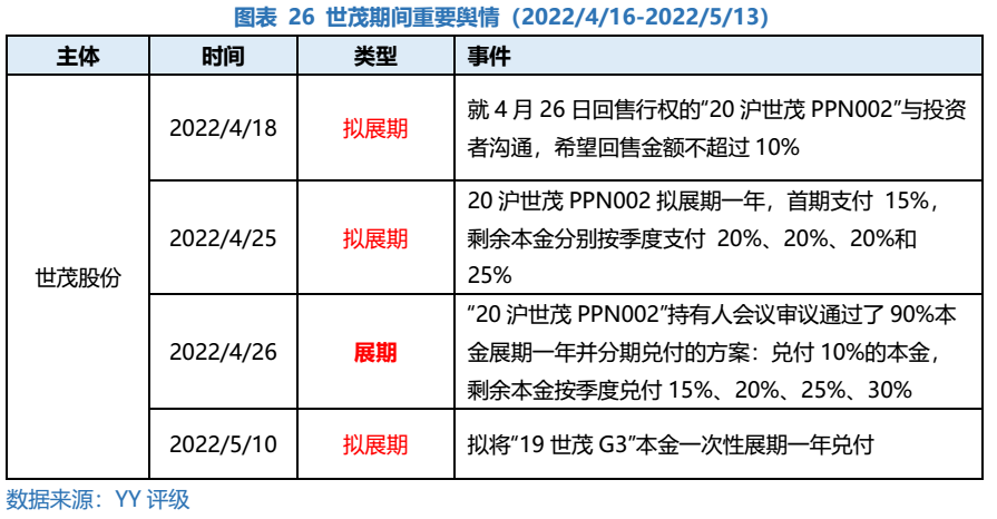 另一熱點(diǎn)主體世茂2022年一季度實(shí)現(xiàn)銷售簽約23億元,同比下降59%,后續(xù)經(jīng)營(yíng)性回款依舊十分艱難,在行業(yè)銷售尚未起色,疊加資產(chǎn)處置進(jìn)展緩慢的情況下,面對(duì)巨大流動(dòng)性壓力,世茂股份的境內(nèi)私募債“20滬世茂PPN002”和“19世茂G3”最終走向展期。同時(shí)世茂擬將“19世茂G3”本金一次性展期一年兌付,該方案低于市場(chǎng)預(yù)期,也反映出行業(yè)仍處于低迷階段。受制于流程、市場(chǎng)行情等因素,不排除展期條款變得更差的情況,若銷售端持續(xù)低迷,二次違約情況也難以避免。