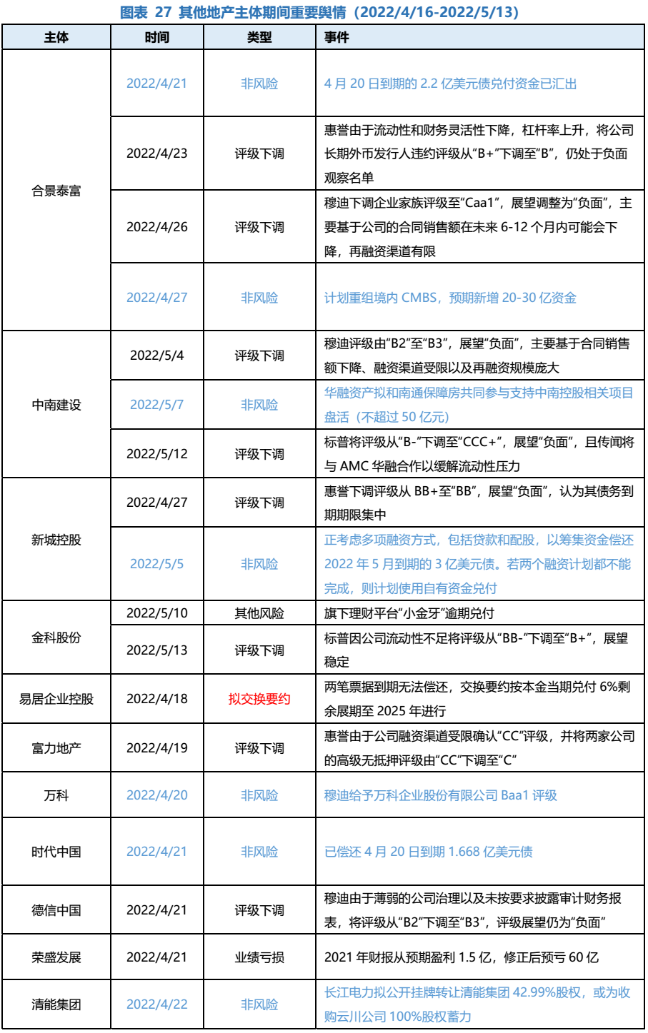 其他地產(chǎn)主體方面,(1)該期間,評(píng)級(jí)下調(diào)的主體有合景泰富、中南建設(shè)、新城控股、金科股份、富力地產(chǎn)、德信中國(guó)、佳源國(guó)際控股、紅星美凱龍、綠地控股集團(tuán)等,下調(diào)原因主要為銷售端降幅明顯、流動(dòng)性緊張、再融資渠道有限和債務(wù)到期期限集中等。(2)發(fā)生業(yè)績(jī)虧損事項(xiàng)的有:榮盛發(fā)展(2021財(cái)報(bào)修正后預(yù)虧60億)、朗詩(shī)集團(tuán)(2021年度合并凈虧損-5.58億)和新希望地產(chǎn)(股東新希望集團(tuán)2021年歸母凈利潤(rùn)-13.6億元)。(3)中梁控股和易居企業(yè)控股均因流動(dòng)性吃緊擬對(duì)境外債進(jìn)行交換要約,其中易居企業(yè)控股主營(yíng)地產(chǎn)數(shù)據(jù)、經(jīng)紀(jì)、代理業(yè)務(wù),表明地產(chǎn)行業(yè)周期向下的影響已經(jīng)蔓延至服務(wù)商等地產(chǎn)三方服務(wù)機(jī)構(gòu)。(4)還值得關(guān)注的典型事件是金科股份理財(cái)產(chǎn)品逾期,暴露流動(dòng)性壓力冰山一角。(5)此外,新城、寶龍、遠(yuǎn)洋和合景泰富仍在努力各項(xiàng)融資方式進(jìn)行再融資緩解償債壓力。