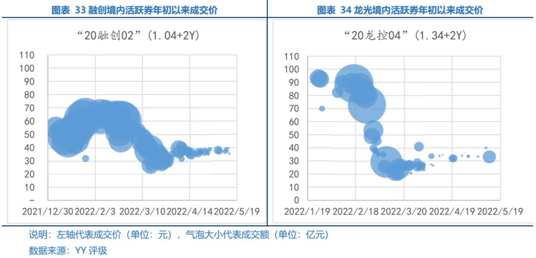 具體來(lái)看,熱點(diǎn)主體方面,融創(chuàng)一方面新增被執(zhí)行人信息、訴訟糾紛等負(fù)面輿情,另一方面由于極度枯竭的流動(dòng)性壓力,選擇“棄外保內(nèi)”:遵循展期方案部分兌付境內(nèi)展期債,而境外美元票據(jù)4筆利息違約,以避免觸發(fā)在岸銀行貸款更大規(guī)模的交叉違約,境內(nèi)外表現(xiàn)出明顯的割裂感。這也是此輪地產(chǎn)暴雷潮中一個(gè)普遍的現(xiàn)象。公司將20融創(chuàng)01展期,寄希望于以時(shí)間換空間,但3-4月份公司重點(diǎn)布局的城市受疫情影響嚴(yán)重,銷售額大幅下滑65%左右,資金回籠難度也進(jìn)一步加大。