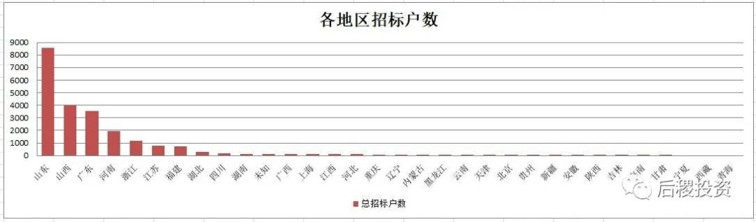 銀行招標次數前五的省份是山東、浙江、廣東、福建和江蘇,戶數前五的省份是山東、山西、廣東、河南和浙江,而披露的金額前五的省份是廣東、山東、浙江、江蘇和福建,山西和河南排第六和第七。總體來說除傳統成交活躍大省外,河南和山西等中部地區省份的銀行的債權招標力度也較大。