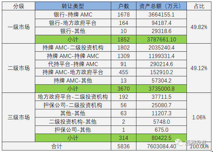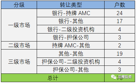一般的,我們將銀行端出讓債權(quán)為一級市場,本地持牌AMC或代持機構(gòu)出讓債權(quán)為二級市場,除此其他債權(quán)轉(zhuǎn)讓為三級市場。