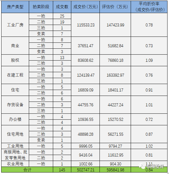 從上表可知,工業(yè)廠房成交量最多,農(nóng)業(yè)用地成交量最少。成交量超過8個(含)的房產(chǎn)類型中,辦公樓的平均折價率最低,為0.72;股權(quán)的平均折價率最高,達到1.09。