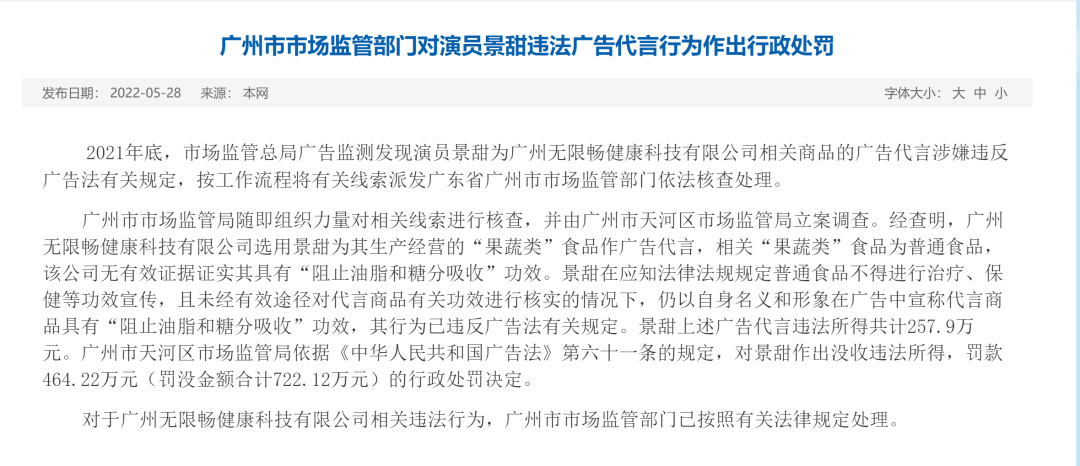 根據廣州市市場監督管理局官網,2022年5月28日,廣州無限暢健康科技有限公司選用景甜為其生產經營的“果蔬類”食品作廣告代言,相關“果蔬類”食品為普通食品,該公司無有效證據證實其具有“阻止油脂和糖分吸收”功效。景甜在應知法律法規規定普通食品不得進行治療、保健等功效宣傳,且未經有效途徑對代言商品有關功效進行核實的情況下,仍以自身名義和形象在廣告中宣稱代言商品具有“阻止油脂和糖分吸收”功效,其行為已違反廣告法有關規定。景甜上述廣告代言違法所得共計257.9萬元。廣州市天河區市場監管局依據《中華人民共和國廣告法》第六十一條的規定,對景甜作出沒收違法所得,罰款464.22萬元(罰沒金額合計722.12萬元)的行政處罰決定。