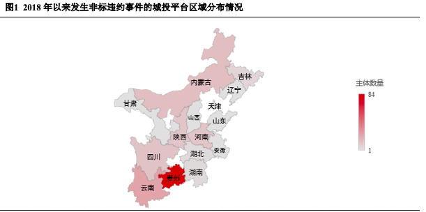 2018年以來,城投平臺非標違約事件頻繁發生,2019年為城投非標違約事件爆發的高峰期,2020年非標違約事件數量有所下降,2021年再次走高,新增非標違約主體(包括融資方和擔保方,下同)數量表現趨同。依據公開資料統計,截至2021年11月底,累計170余家城投平臺發生非標違約事件,涉及15個省、自治區及直轄市。從區域分布來看,貴州省為全國發生非標違約事件的城投平臺數量最多的地區,超過80家;云南省、內蒙古、四川省、陜西省、河南省發生非標違約事件的城投平臺超過10家;吉林省、湖南省、天津市、湖北省發生非標違約事件的平臺數量不超過5家。