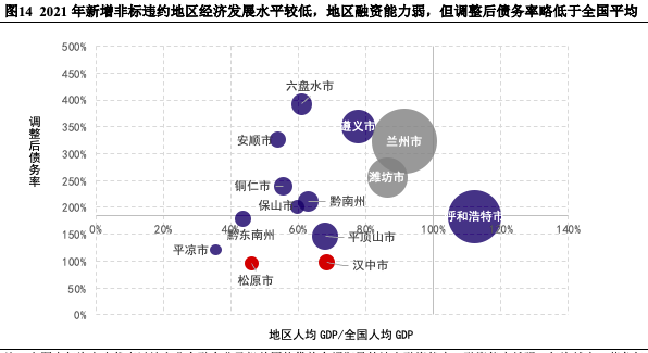 注:上圖中氣泡大小代表以地方非金融企業及機關團體貸款余額衡量的地方融資能力,融資能力越強,氣泡越大。藍色氣泡為2020年及以前發生非標違約事件的地區,紅色氣泡為2021年新增非標違約地區,灰色氣泡為2021年發生輿情事件的典型地區。原點坐標軸為全國平均值(100%,184.56%)。