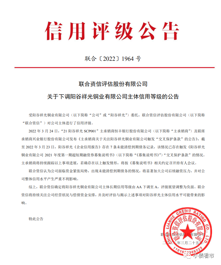 公告顯示,截至2022年3月23日,陽谷祥光《企業(yè)信用報告》存在7條未能清償?shù)狡趥鶆?wù)記錄,已觸發(fā)《陽谷祥光銅業(yè)有限公司2021年度第一期超短期融資券募集說明書》“交叉保護條款”。