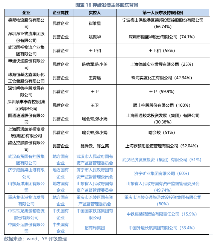 信用債市場方面,上市公司中高頻出現的“多式聯運”、“智慧物流”、“供應鏈管理”等概念在發債主體中熱度不高,主要仍以傳統物流企業為主。截至22年3月末,YY行業為物流的存續債主體共有16家,債券余額合計為402.88億元。行業整體毛利率不高(平均13%),杠桿率偏低(平均資產負債51.3%)。資質方面,貨代龍頭中國外運信用資質最好,中鐵鐵龍集裝箱背靠國鐵集團資源,信用資質也較好。快遞細分領域集中度較高,市場格局相對穩定,也有較強的經營獲現能力支撐,順豐、韻達、圓通信用資質尚可,申通快遞盈利較差,資質稍弱。濟寧港航梁山港、珠海恒基達鑫、重慶龍頭港等工業品物流企業信用資質較弱。