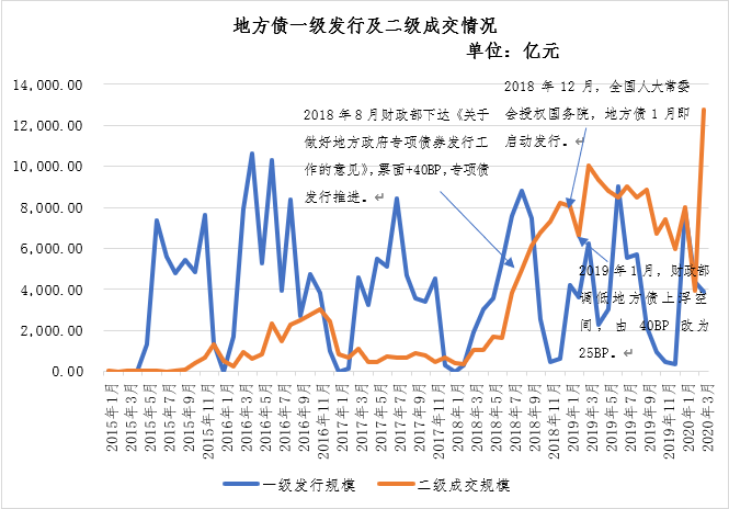 根據(jù)萬(wàn)德數(shù)據(jù)顯示,2020年3月地方債交易規(guī)模創(chuàng)出歷史新高,交易規(guī)模達(dá)到1.2萬(wàn)億,雖較于國(guó)債、同業(yè)存單約單動(dòng)輒4、5萬(wàn)億成交規(guī)模,仍屬于“弟弟范疇”。但較于2018年以前不足5000億的成交規(guī)模,已獲得長(zhǎng)足進(jìn)步。但與國(guó)債等活躍券種伴隨發(fā)行量擴(kuò)大,交易規(guī)模呈現(xiàn)波動(dòng)中上行不同(除去春節(jié)期間受假期影響),地方債部分時(shí)間點(diǎn)成交規(guī)模甚至不及前期。