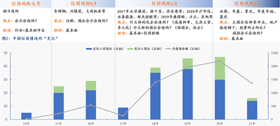 從有違約開始,信用債又經(jīng)歷了好幾波小的周期,但是從2014年肇始的違約,一直到現(xiàn)在,我們很可能處于同一個大的周期里:金融去泡沫的階段里,對于一些歷史的存量問題,試圖解決。