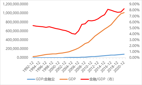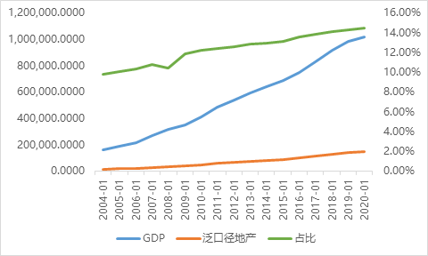 另外一個維度則是房地產(chǎn)+建筑業(yè)的泛房地產(chǎn)行業(yè)占比,這個口徑缺失了有關(guān)上下游拉動如鋼鐵、水泥、混凝土、建材、家居、家電等,但是建筑業(yè)的話也含基建,所以兩者一減一增,簡單作為房地產(chǎn)口徑的衡量指標(biāo),可以看出經(jīng)濟(jì)體以鋼筋混凝土的房子作為衡量,整體2020年末占比接近14.52%,意味著整個房地產(chǎn)對于分配環(huán)節(jié)蛋糕的切分增幅巨大。