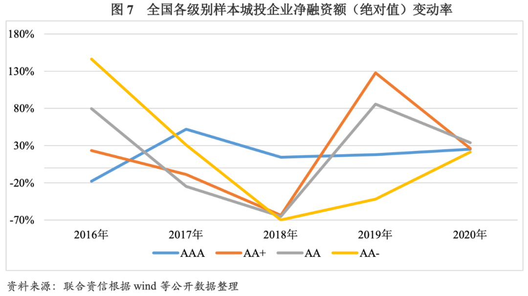 2015年至2021年上半年,樣本城投企業凈融資情況在絕對值和比值的表現形式下呈相同走勢,且與非金融企業杠桿率同趨勢變化。不同區域、信用級別樣本城投企業凈融資情況對監管政策寬松程度的敏感及響應速度有所不同,其中所在區域經濟相對較弱、信用級別較低的樣本城投企業在監管政策趨緊時,外部融資環境更為嚴峻;區域經濟相對較強、信用級別較高的樣本城投企業在嚴監管下韌性較強。