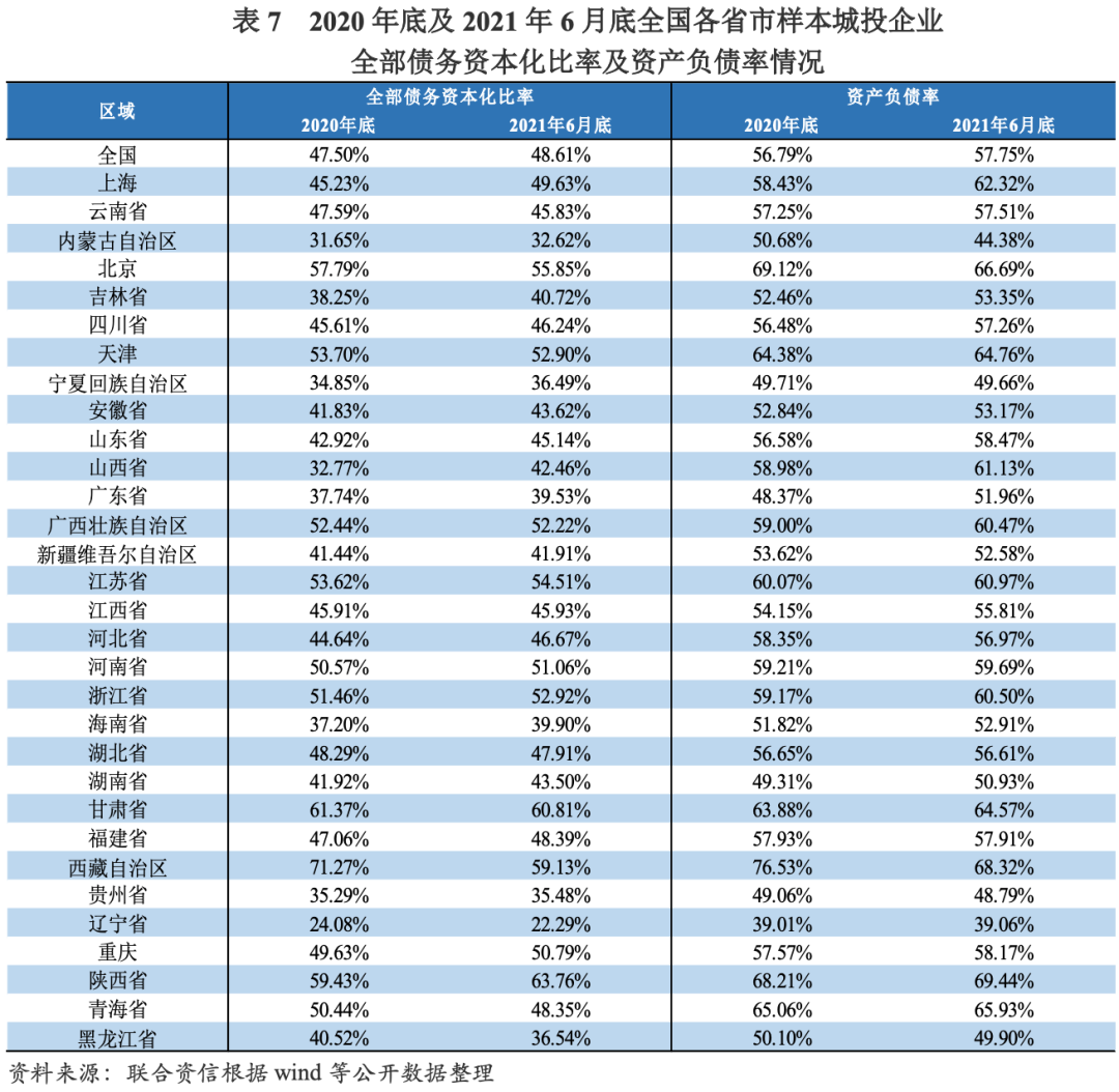 2015-2020年,樣本城投企業資產負債率及全部債務資本化比率均持續上升,但增速自2018年后逐步趨緩;2021年上半年,樣本城投企業資產負債率、全部債務資本化比率增長幅度均較2020年底呈下降趨勢。