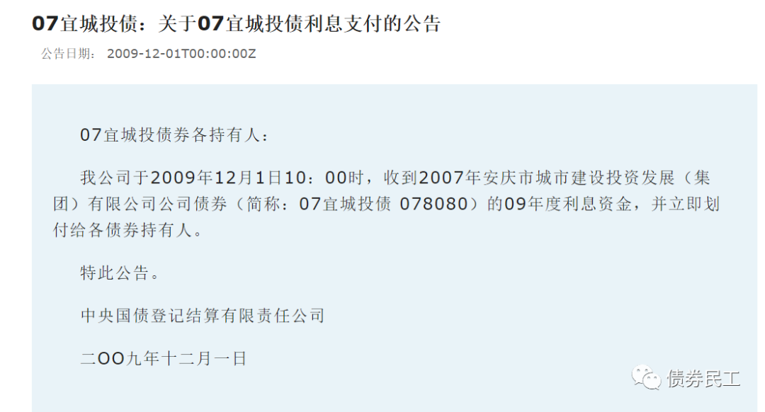 安慶市城市建設投資發展(集團)有限公司于2007年11月30日發行了“2007年安慶市城市建設投資發展(集團)有限公司公司債券”(以下簡稱“07宜城投債”),付息日為每年的11月30日。“07宜城投債”本應該于2009年11月30日本期債券2009年度的支付債券利息,但是實際上支付時間為2009年12月1日,延遲了一天。安慶城投發布致歉信,明確利息延遲支付的原因是工作失誤。