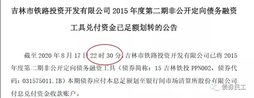吉林市鐵路投資開發有限公司于2015年8月17日發行了“ 吉林市鐵路投資開發有限公司2015年度第二期非公開定向債務融資工具”(以下簡稱“15吉林鐵投PPN002”),到期日為2020年8月17日。“15吉林鐵投PPN002”于2020年8月17日當天17:00點前未完成資金劃付,出現了技術性違約。2020年8月17日晚上,發行人出具了“兌付資金已經足額劃轉的公告”,已經于17日晚上22點30分完成了資金的劃轉工作。