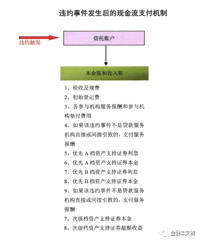 上圖所示產品有A、B檔兩個層級及次級,當出現違約事件后,償付順序是優先A檔本金、利息   優先B檔本金、利息   次級本金及超額收益。當優先A檔本息正常兌付時,而B檔本息無法正常兌付時,優先B檔發生實質違約,而當次級本金損失,而優先A、B檔正常兌付本息時,小編認為沒有發生實質違約,風險事件會影響現金流分配但不一定導致違約。