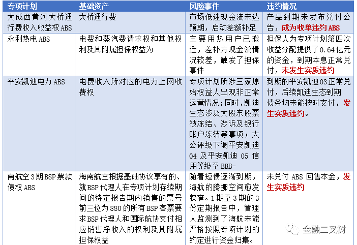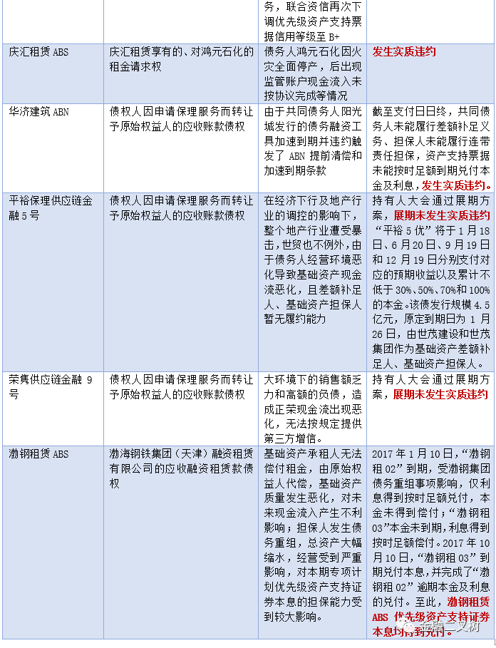 當現金流惡化時,到期現金流不足以支付優先級本息時,觸發增信措施,這時候通常不認為發生違約,而是觸發風險事件,當所有增信措施不足以覆蓋優先級本息時,我們認為ABS產品發生實質違約。