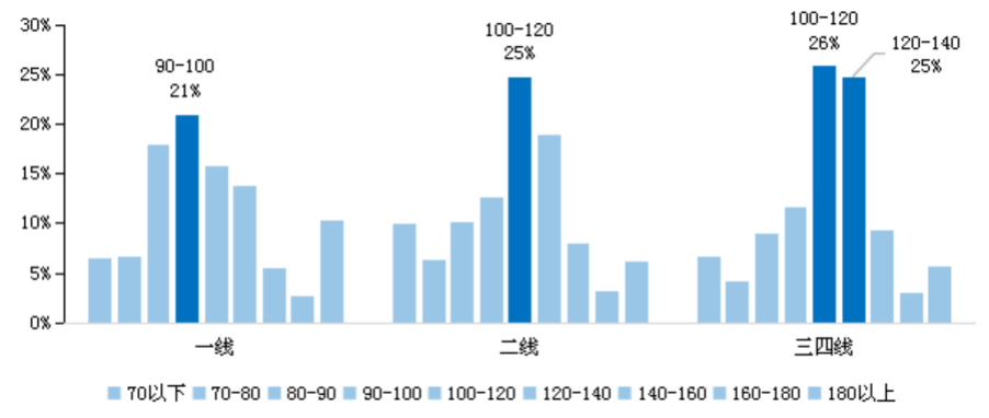 二三線城市主力庫存則落在100-120平方米,主要原于新房房價與居民購買力關系適中,市場供求主力的剛需戶型以三房100-120平方米為主;其中值得注意的是三四線城市100-120平方米與120-140平方米庫存占比不分伯仲,均在25%左右。