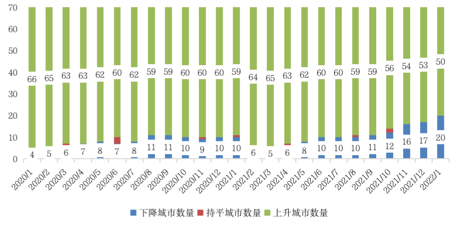 2022年2月21日,國家統計局公布了2022年1月份70個大中城市住宅銷售價格統計數據。新建商品住宅銷售價格環比降勢減弱,環比下降城市個數減少。信貸邊際寬松暖風陣陣,廣州、寧波、溫州等多個城市房價止跌回升。
