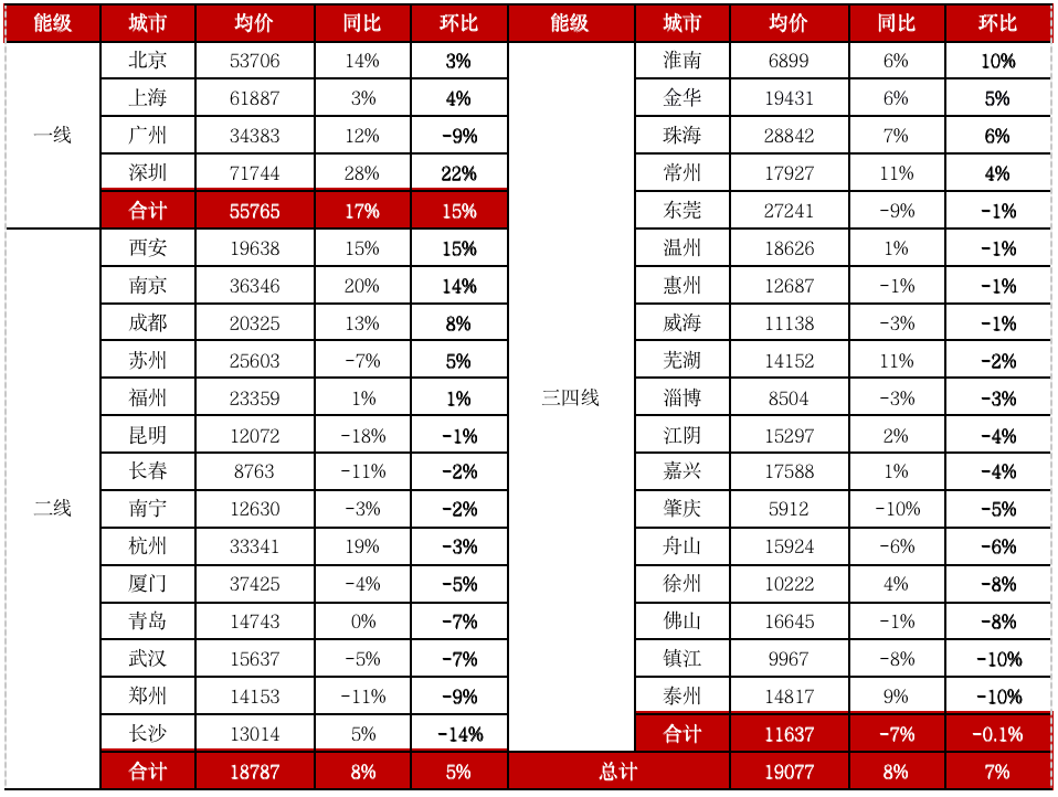 具體來看,一線城市中北京、上海、廣州和深圳分別環比上漲1.0%、0.6%、0.5%和0.5%;二線城市中16城環比上漲,重慶漲幅最大達0.9%,寧波、武漢、濟南、南寧、貴陽、昆明等多城為半年內首度環比回正。