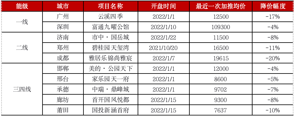 表:2022年典型城市1月部分降價項目(元/平方米、%)