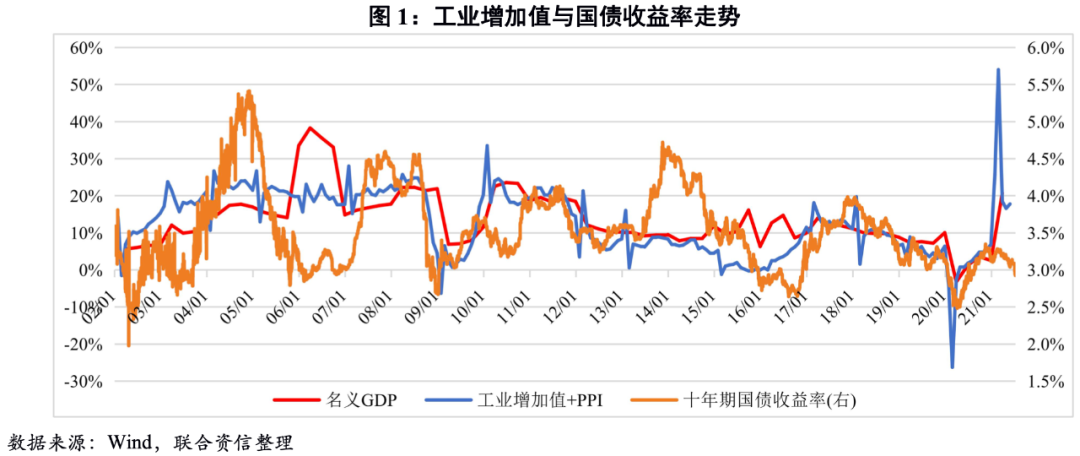 利率水平由資金的供給端和需求端共同決定,名義增長率代表資金的需求,是利率的決定性因素之一,二者間存在較高的相關(guān)性。名義增長的代表性指標(biāo)主要是名義GDP增速,但由于GDP數(shù)據(jù)的披露頻率較低,本報(bào)告以“工業(yè)增加值同比增速+通貨膨脹率”作為名義增長率的替代指標(biāo),以此跟蹤分析當(dāng)前利率水平并預(yù)判未來走勢。