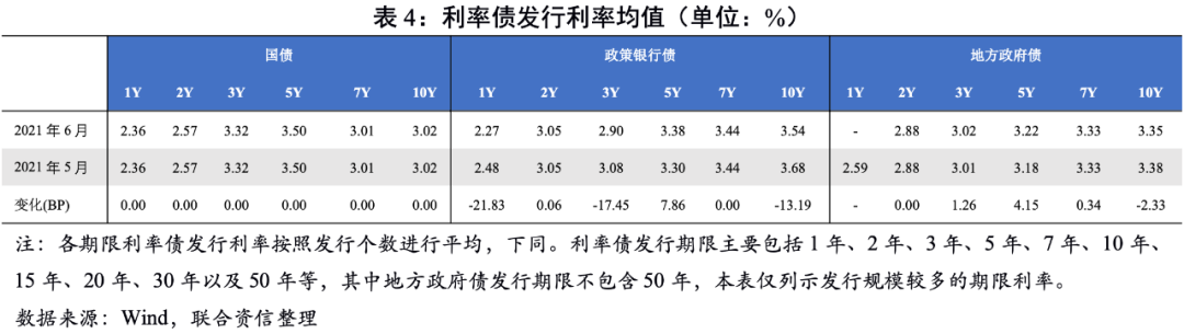 從發(fā)行利率看,6月國債均集中在上半月發(fā)行,各期限發(fā)行利率均值持平5月;政策銀行債發(fā)行利率小幅波動,2年期和5年期平均發(fā)行利率較5月上行;地方政府債發(fā)行利率上半月小幅走高,在官媒發(fā)聲[1]疊加央行加大公開市場投放后,市場對資金過度收緊的擔(dān)憂有所緩解,下半月地方政府債發(fā)行利率小幅下行。整體看,中長期限利率債平均發(fā)行利率有所上行。