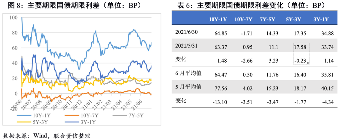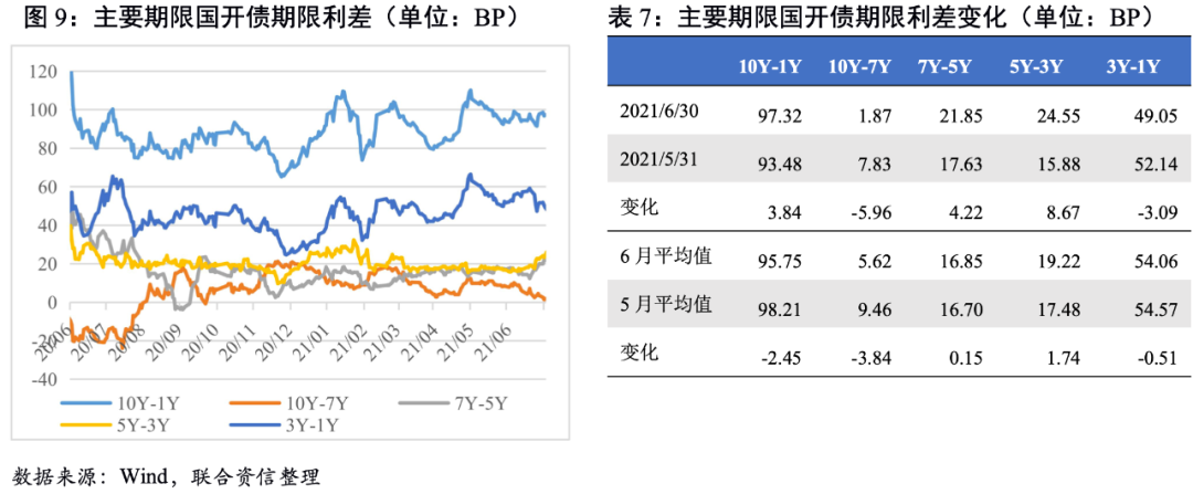 期限利差大多收窄。從期限利差來看,國債10Y-1Y及3Y-1Y期限利差波動較大,都呈現(xiàn)上半月期限利差收窄、下半月期限利差走闊的軌跡。國開債除10Y-1Y期限利差波動較小外,其余期限利差均經(jīng)歷了較大的波動。整體看,6月主要期限國債和國開債期限利差均值大多較5月收窄,收益曲線趨向平坦化。