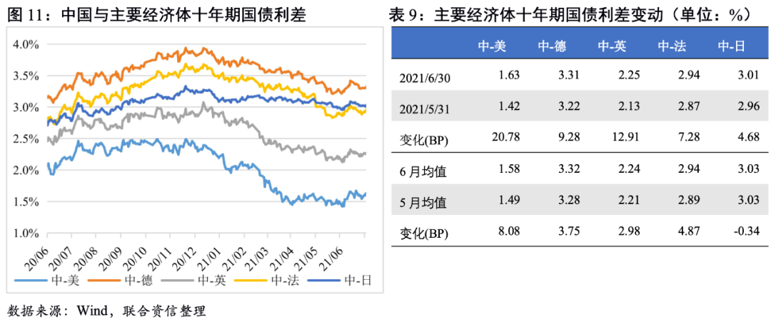 截至6月末,我國與主要經(jīng)濟(jì)體的利差較5月末均進(jìn)一步走闊,其中與美國的利差上升幅度最大。6月美國十年期國債收益率整體呈震蕩下行走勢,由1.58%下行至1.45%,主要是由于月初非農(nóng)就業(yè)不及預(yù)期,市場修正對前期經(jīng)濟(jì)增長樂觀的預(yù)期。三季度美國經(jīng)濟(jì)預(yù)期較為樂觀,同時(shí)美聯(lián)儲釋放鷹派信號疊加美國通脹超預(yù)期上行,綜上分析預(yù)計(jì)三季度美債收益率有望重回上行渠道,中美十年期國債利差或?qū)⒂兴照?。除美國外?月我國與德國、英國和法國的十年期國債利差均值均有所上升,與日本利差則小幅收窄,日本國債利率下行幅度小于我國。