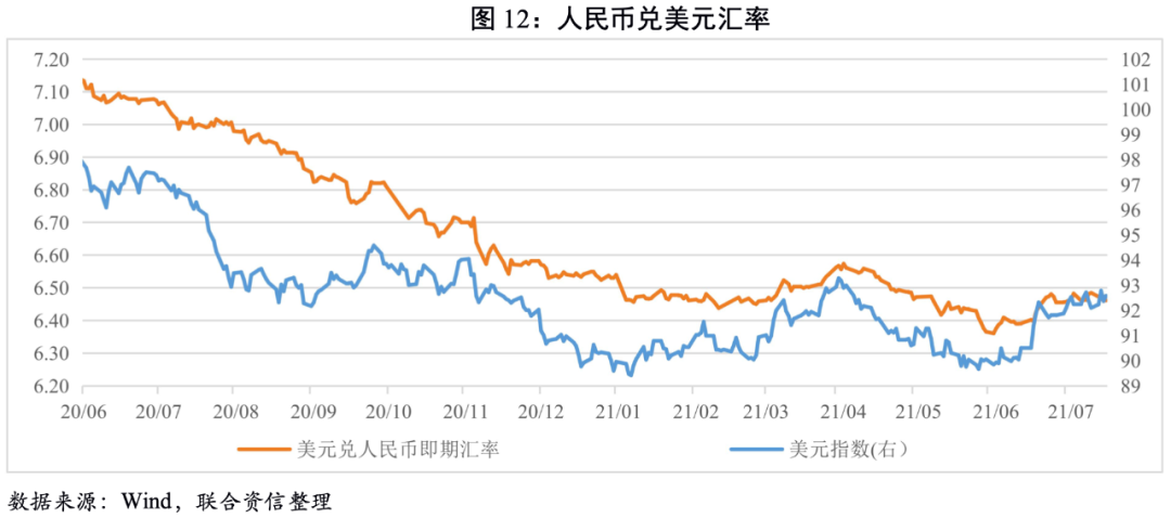 從基本面看,下半年在基數(shù)的影響下我國經(jīng)濟(jì)增速逐季下行,而美國隨著疫苗的推廣,經(jīng)濟(jì)有望進(jìn)一步修復(fù);從貨幣政策端看,6月美聯(lián)儲定下了鷹派議息的基調(diào),疊加美國通脹預(yù)期抬升。綜合來看,美元指數(shù)有望進(jìn)一步走強(qiáng),人民幣兌美元匯率或?qū)⑦M(jìn)入震蕩區(qū)間。7月中美利差收窄疊加美元指數(shù)的走強(qiáng),人民幣匯率或?qū)⑿》H值,預(yù)計(jì)7月美元兌人民幣匯率區(qū)間大致為6.39~6.52附近。短期內(nèi)需要關(guān)注利率債跨國投資風(fēng)險(xiǎn)。